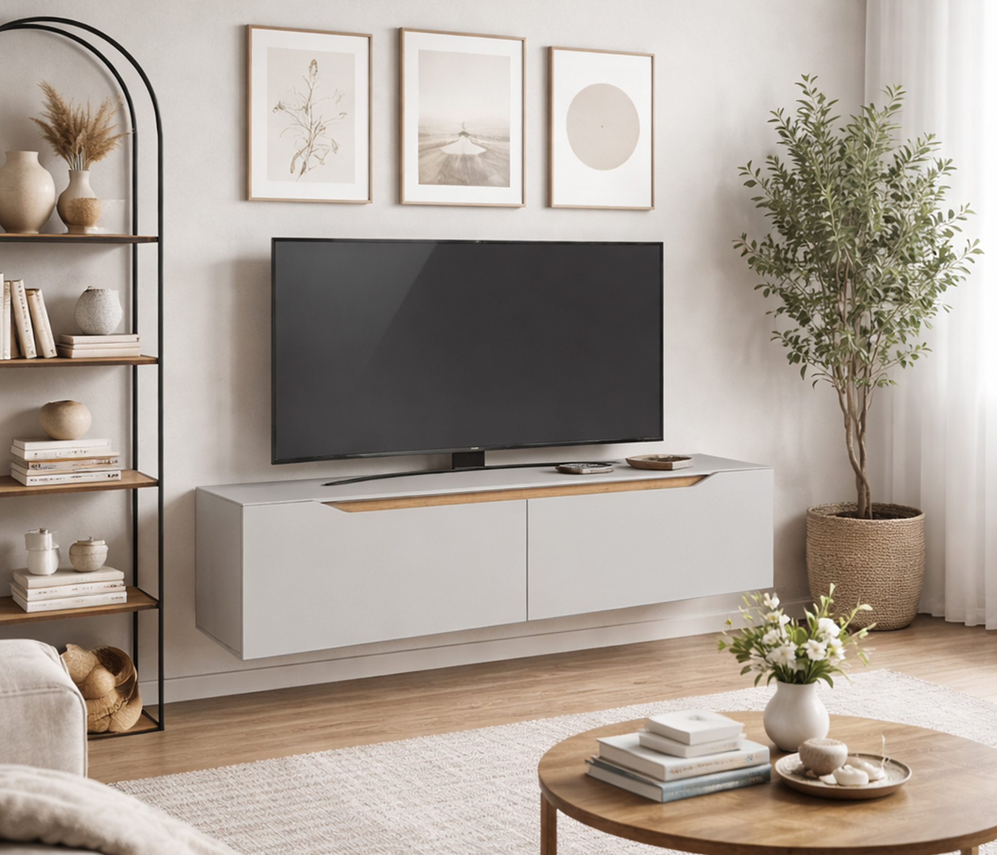 - Подвесная тумба под телевизор монтируется на стену и не касается пола. Она визуально делает пространство легче и упрощает уборку — под ней легко проехать пылесосу.