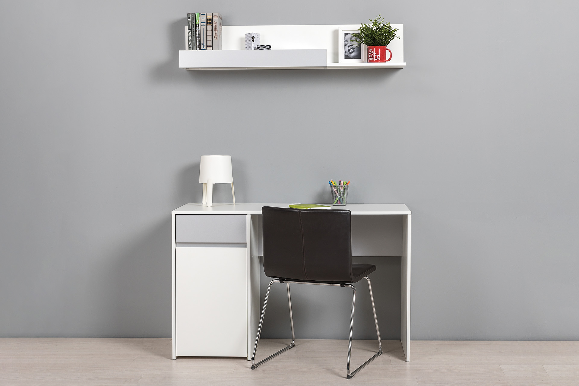Базовый белый цвет, сочетаясь с акцентным серым, создаёт нейтральную основу интерьера, чтобы подчеркнуть личные вещи и аксессуары.