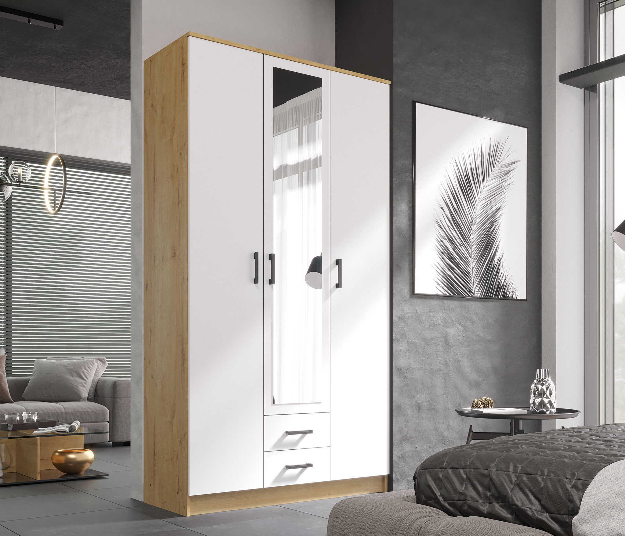Распашной шкаф с зеркалом ТРИО поможет вам удобно и бережно хранить множество нужных вещей. Модель подойдёт для меблировки любого помещения с современным стилем интерьера.¶Изделие произведено из прочной ЛДСП, благодаря чему будет радовать вас своим качеством на протяжении долгих лет.¶Центральная дверца шкафа оснащена зеркальным полотном, что является очень практичным решением. Использование зеркальных поверхностей в интерьере гарантирует визуальное увеличение пространства и улучшение уровня освещенности.Гарантия 18 месяцев