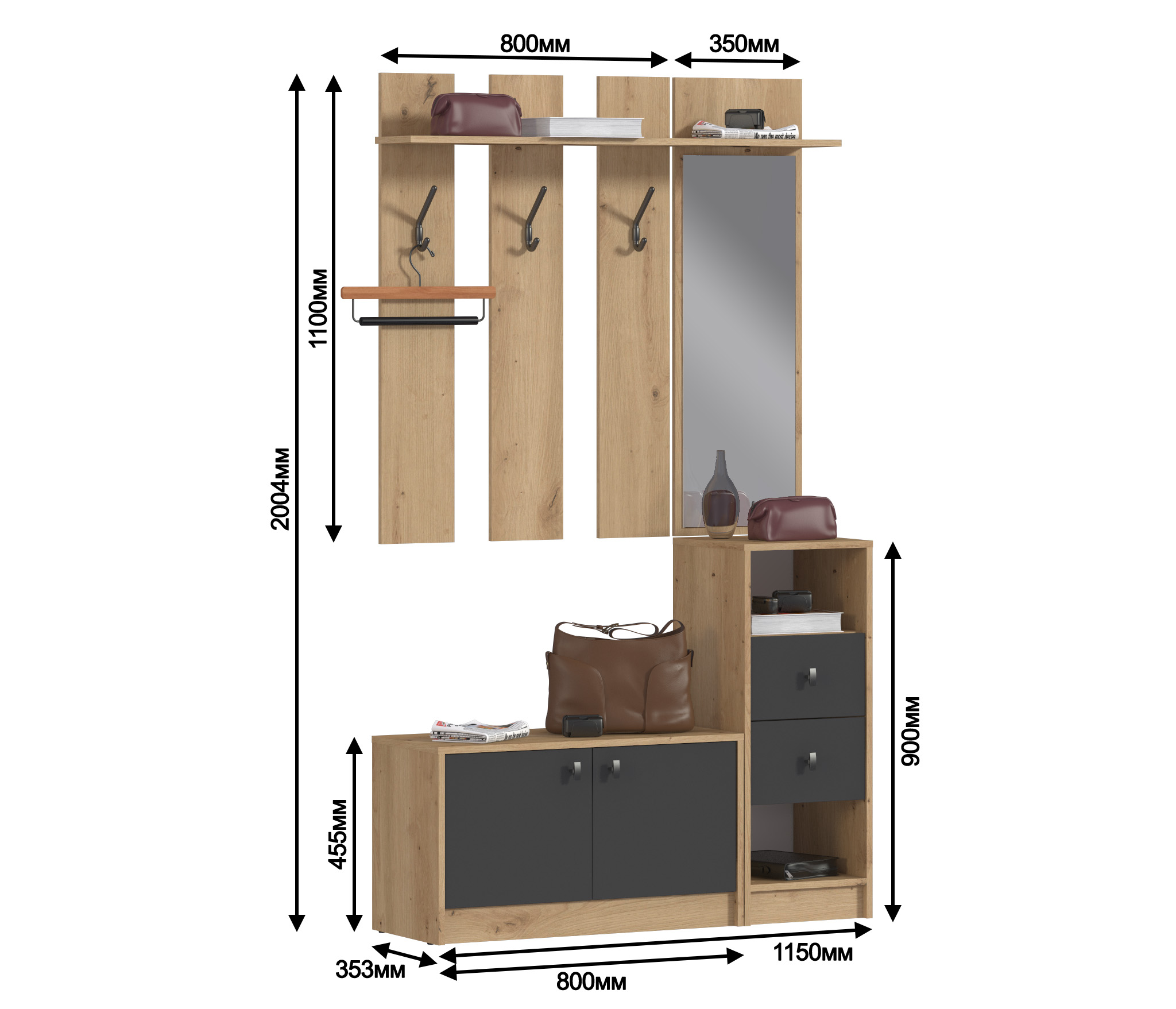 Модульная конструкция "Сидней" разработана для небольших помещений. Каждый модуль оптимизирован для экономии места, предлагая максимальную функциональность на минимальной площади. Вы можете создать свой собственный вариант прихожей, подбирая модули в соответствии с вашими потребностями и предпочтениями.