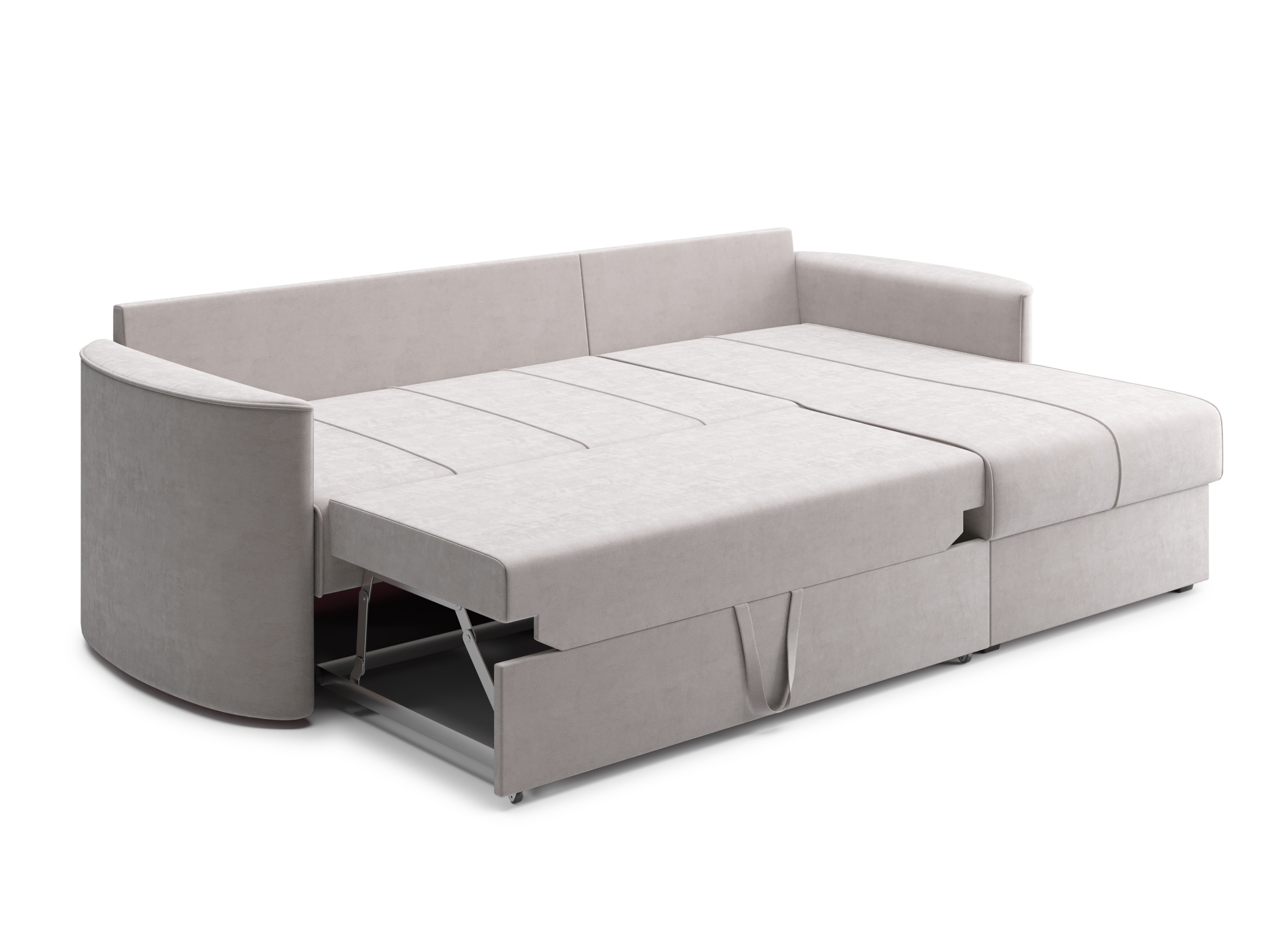 - Механизм раскладки дельфин – основан на выкатывании дополнительной платформы, скрытой под сидением дивана. Чтобы разложить диван, нужно потянуть за специальные ремешки, помогающие перемещать элементы конструкции. В результате этого действия нижняя часть дивана начнёт перемещаться. Делать это нужно до тех пор, пока часть не выдвинется максимально вперед. Затем следует немного приподнять элемент и упереть в противоположную часть, которая осталась неподвижной. Под сиденьем дивана находится короб для хранения вещей и постельных принадлежностей.