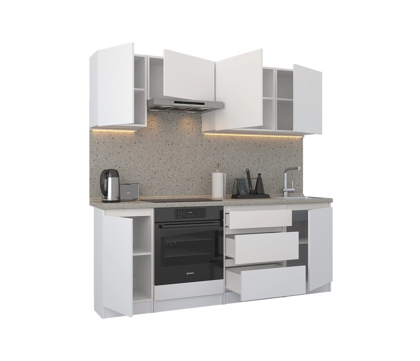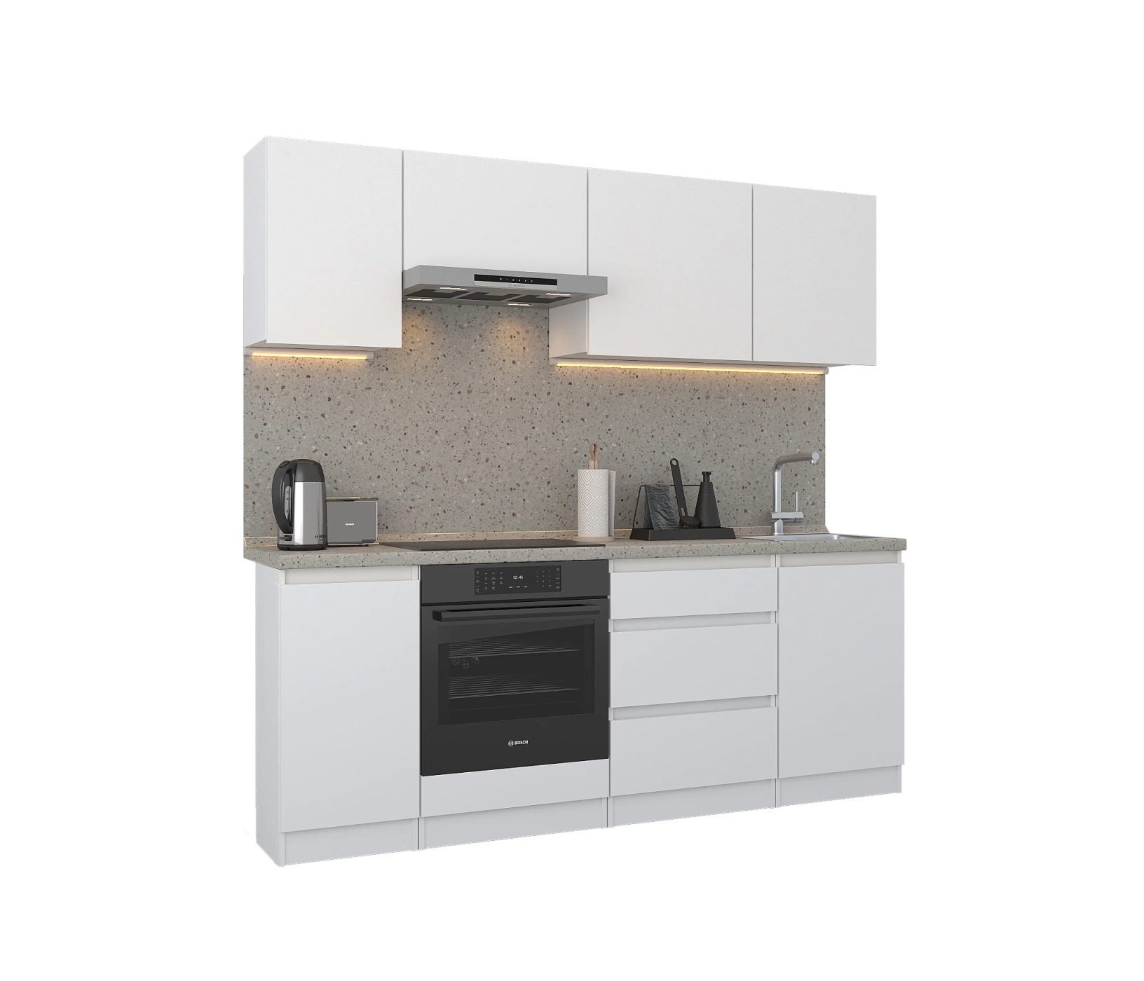 Кухня Леон сочетает в себе функциональность, стиль и доступность, и является прекрасным выбором для тех, кто ищет компактное и удобное решение для своей кухни. Кухонный гарнитур Леон идеально подходит для помещений с ограниченным пространством. Корпус и фасады выполнены из белого ЛДСП. Фасады столов и шкафов не имеют лицевой фурнитуры и открываются захватом за тыльный край фасада. Леон смотрится современно, а отсутствие ручек упрощает уход за поверхностью.