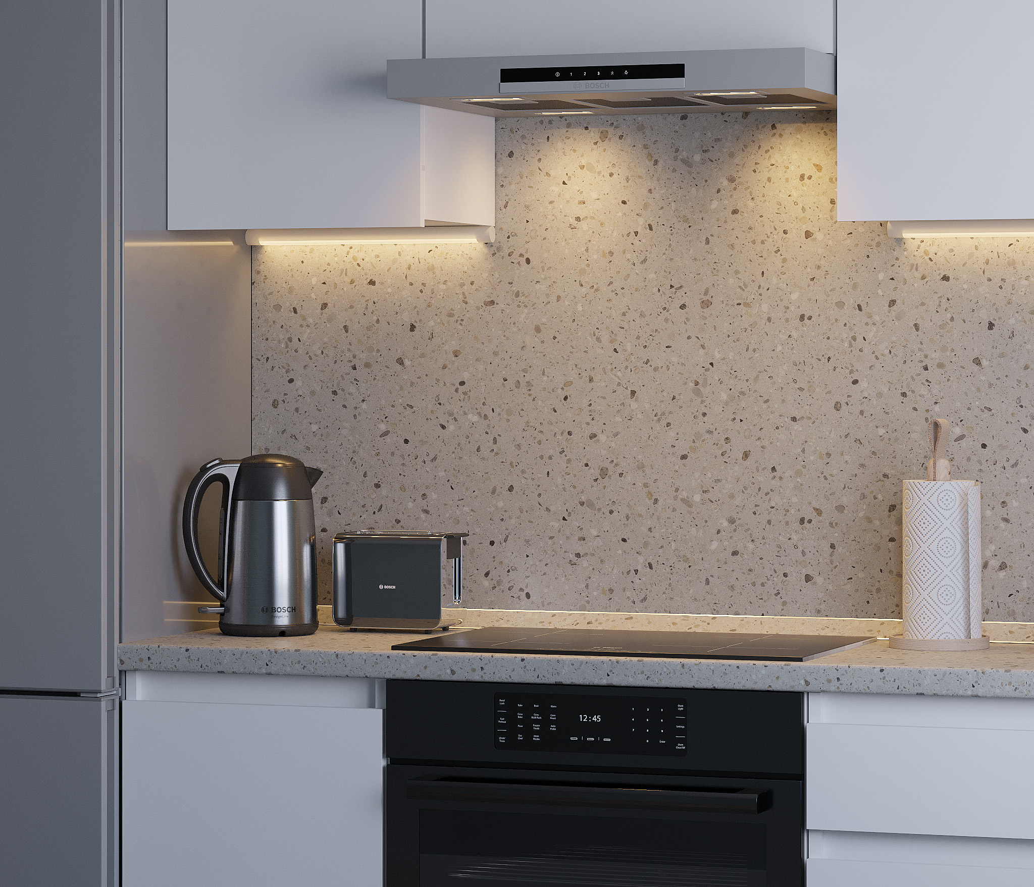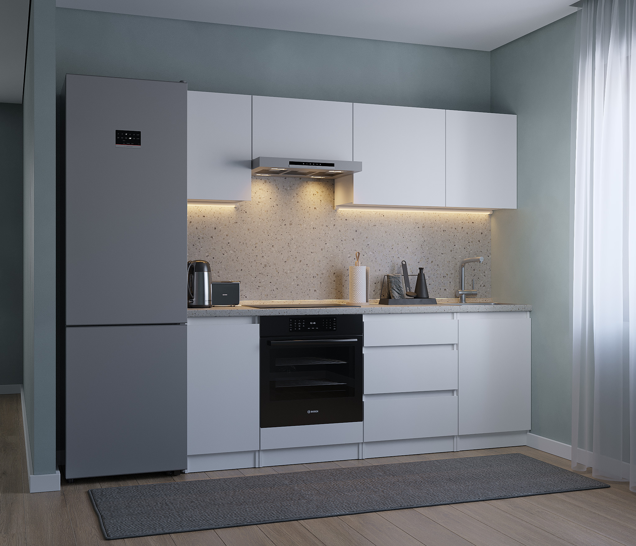 Кухня Леон сочетает в себе функциональность, стиль и доступность, и является прекрасным выбором для тех, кто ищет компактное и удобное решение для своей кухни. Кухонный гарнитур Леон идеально подходит для помещений с ограниченным пространством. Корпус и фасады выполнены из белого ЛДСП. Фасады столов и шкафов не имеют лицевой фурнитуры и открываются захватом за тыльный край фасада. Леон смотрится современно, а отсутствие ручек упрощает уход за поверхностью.