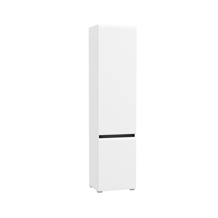 Шкаф конструктивно разделён на два отделения за распашными дверками - верхнее и нижнее. За распашной дверкой верхнего отделения располагаются три полки, за дверкой нижнего - одна. Лаконичные белые глянцевые фасады из МДФ 16 мм создают ощущение чистоты и свежести, лёгкости, свободного пространства. Акцентом выступают чёрные горизонтальные вставки между фасадами. Фасады могут открываться за край, либо нажатием, с помощью механизма Push-to-Open, позволяющий отказаться от использования ручек. Фасады оснащены доводчиками, что обеспечивает плавное закрывание и исключает удар о корпус. Универсальная сборка - сторону открывания дверей, Вы определяете при сборке. Мебель выполнена из прочной ламинированной ДСП 16 мм, торцы деталей закромлены плёнкой ПВХ 0,4-2 мм. Фасады выполнены из МДФ 16 мм белый глянец.