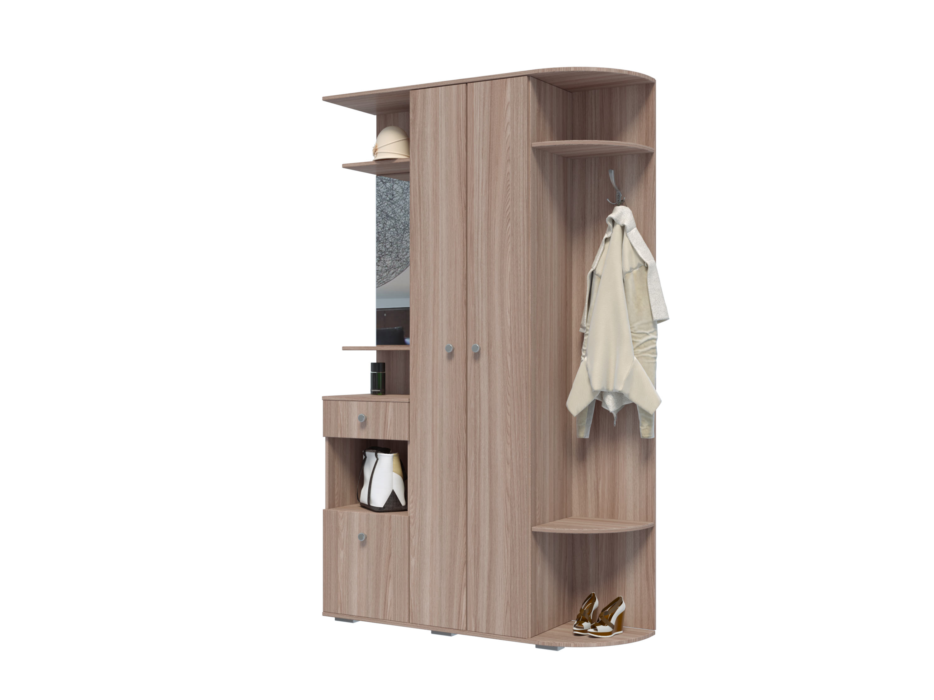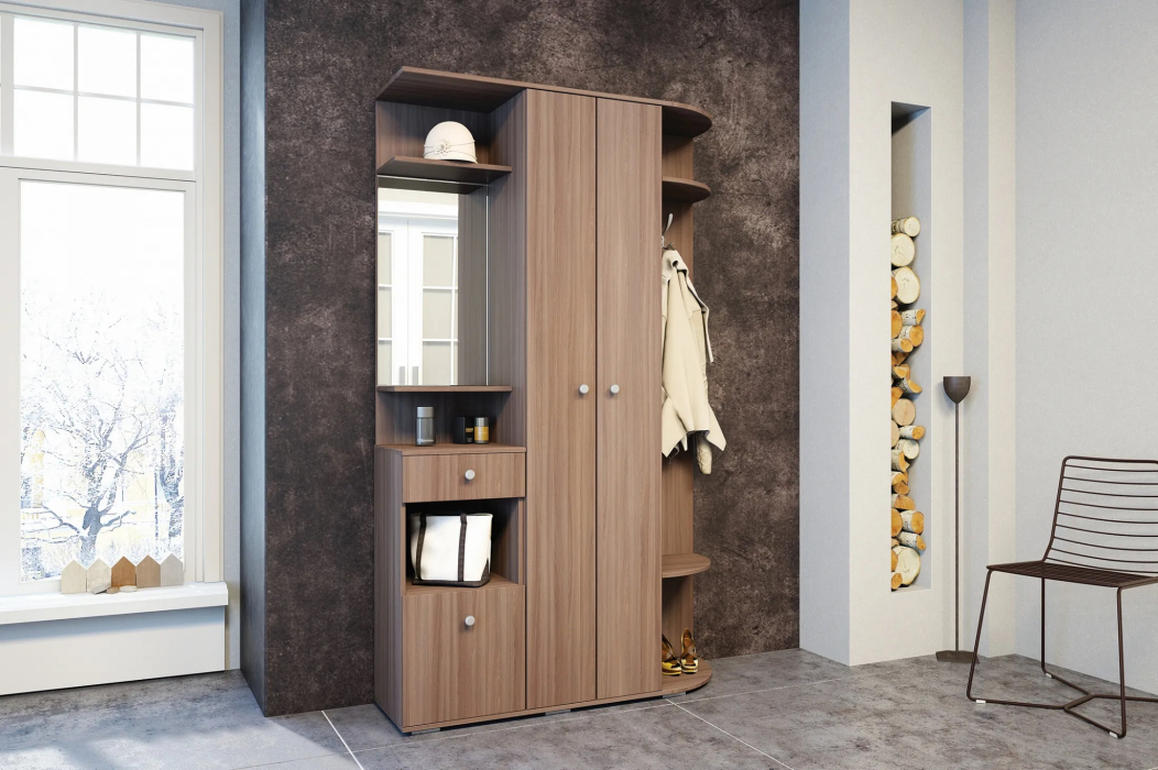 Прихожая Виза станет визитной карточкой вашего дома и поможет организовать место для аккуратного хранения одежды и обуви. Множество полочек и выдвижной ящик позволят с удобством разместить флаконы с духами, средства по уходу за обувью и множество других аксессуаров.