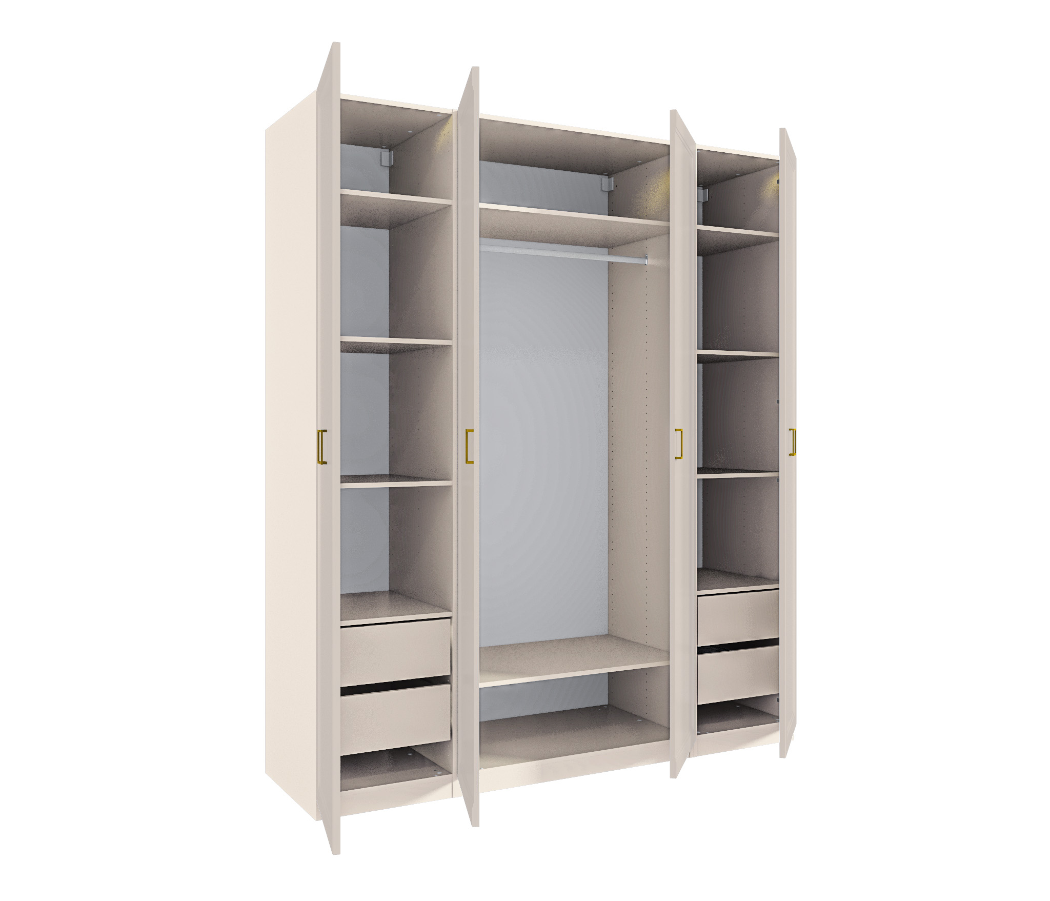 Четырехдверный шкаф Ассоль — стильное и практичное решение для вашего интерьера. Корпус из прочного ЛДСП и фасады из качественного МДФ с элегантными золотыми ручками придают шкафу изысканный вид. Внутреннее наполнение включает полки, ящики и штангу для одежды, обеспечивая удобство и порядок в хранении вещей. Идеально подходит для любой комнаты!