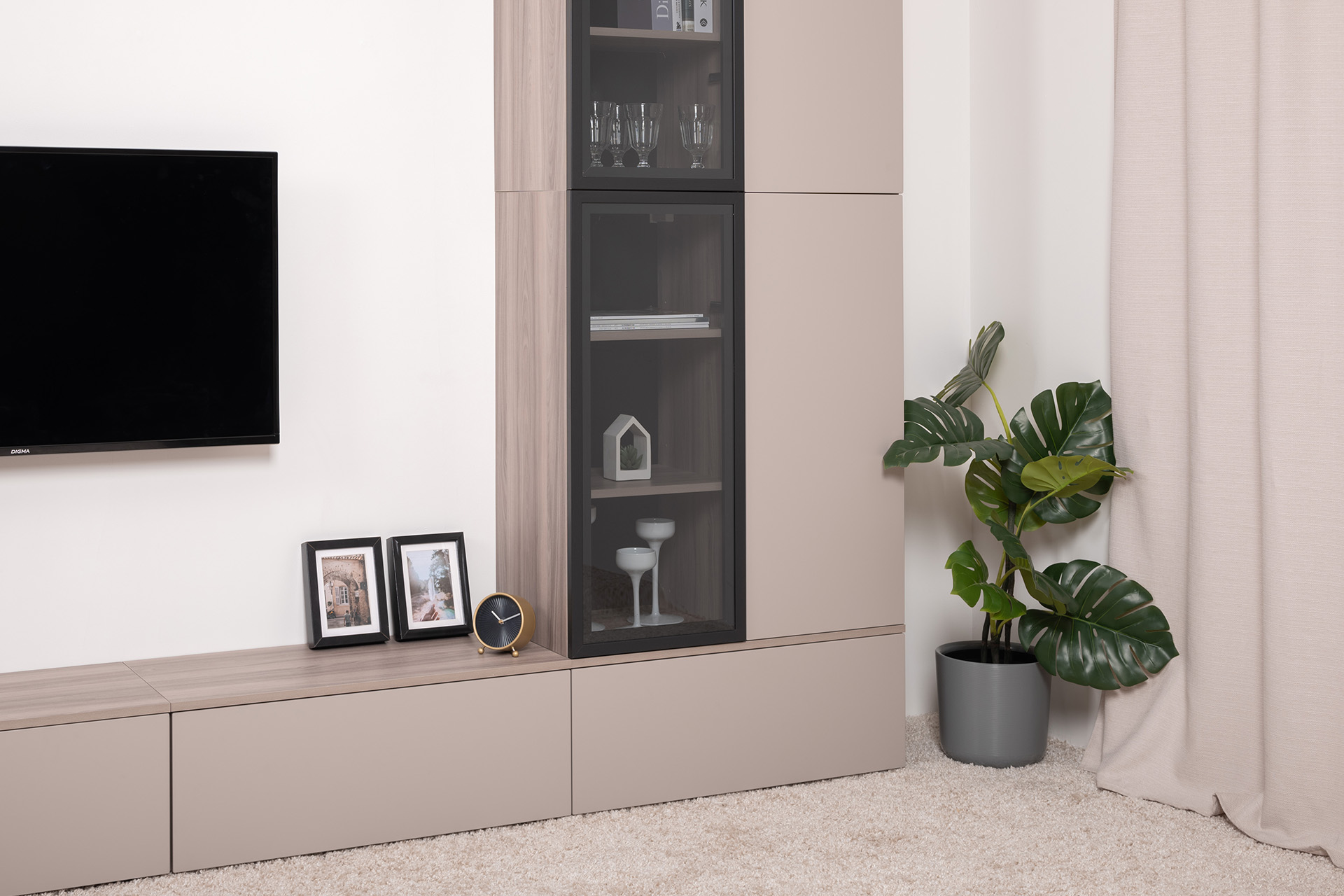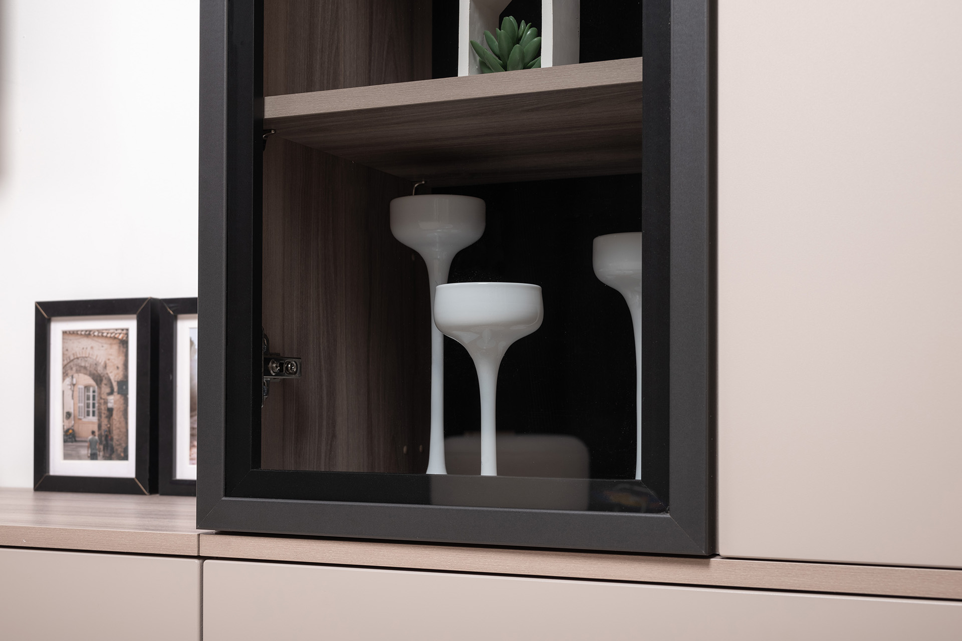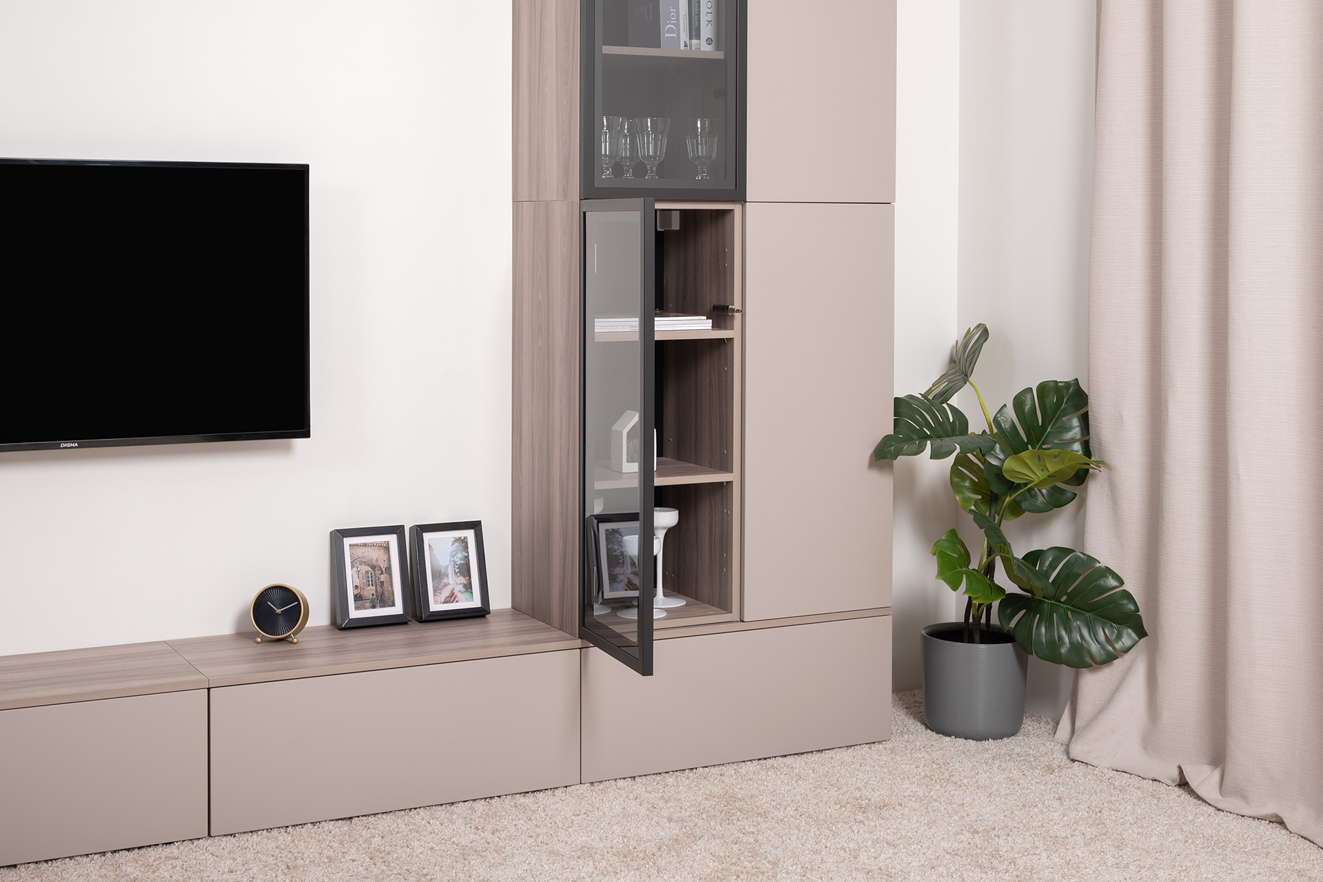 Разнообразие модулей и возможность их напольной и настенной установки позволит создать гостиную оптимальной конфигурации. Распашные фасады с механизмом push-to-open, направляющие скрытого монтажа в ящиках, петли с доводчиками, регулируемые опоры, крепеж в комплекте – комфорт продуман до мелочей.