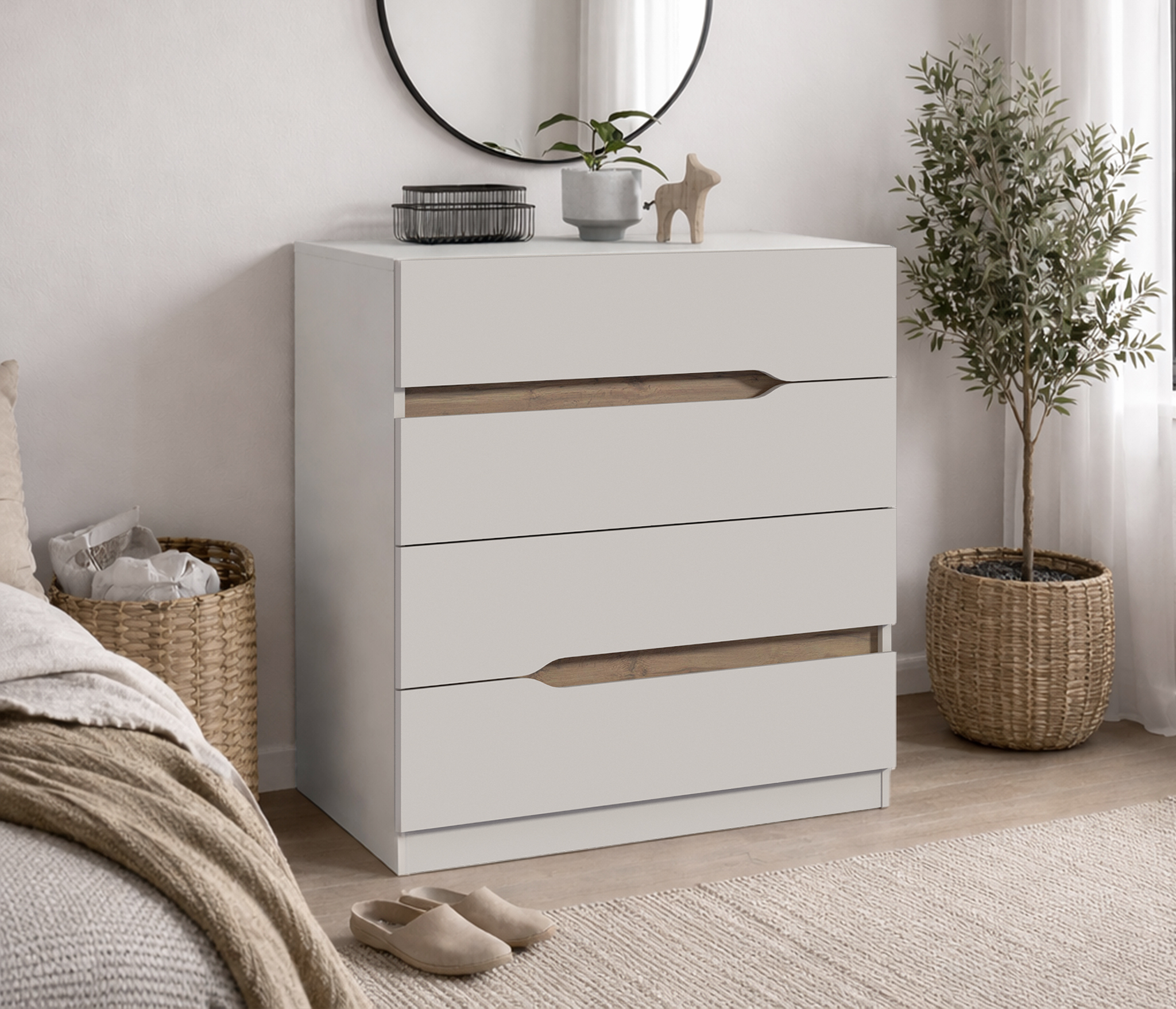 Особенностью данной модели являются плавные вырезы в фасадах, которые не только удобны для открывания, но и добавляют оригинальности. Внутри этих вырезов расположены вставки цвета Дуб вотан, что создает контраст и подчеркивает эстетику мебели.