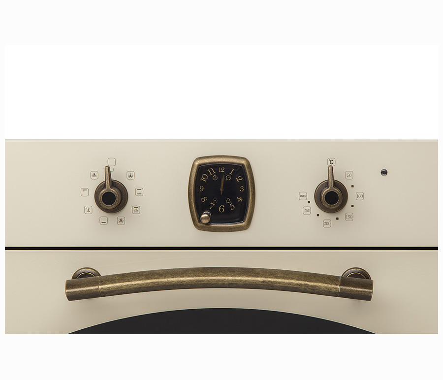 Духовой шкаф в ретро-дизайне, аналоговые часы в классическом стиле Frank Muller с функцией времени, таймера и отключения, 8 режимов нагрева, объем духовки 67 л, телескопические направляющие на одном уровне, трехслойное остекление, каталитическая самоочистка, автоматическое отключение, в комплекте: 2 противня, хромированная решетка, стеклянный противень, цвет - слоновая кость; цвет ручек - бронза
