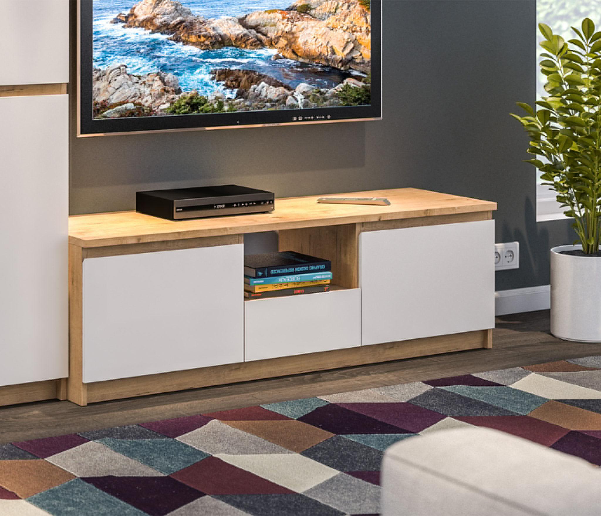 Габаритные размеры – ширина 140 см, высота 35 см и глубина 35 см. Внутри, за открывающейся снизу-вверх дверцей, расположены два вместительных отделения.