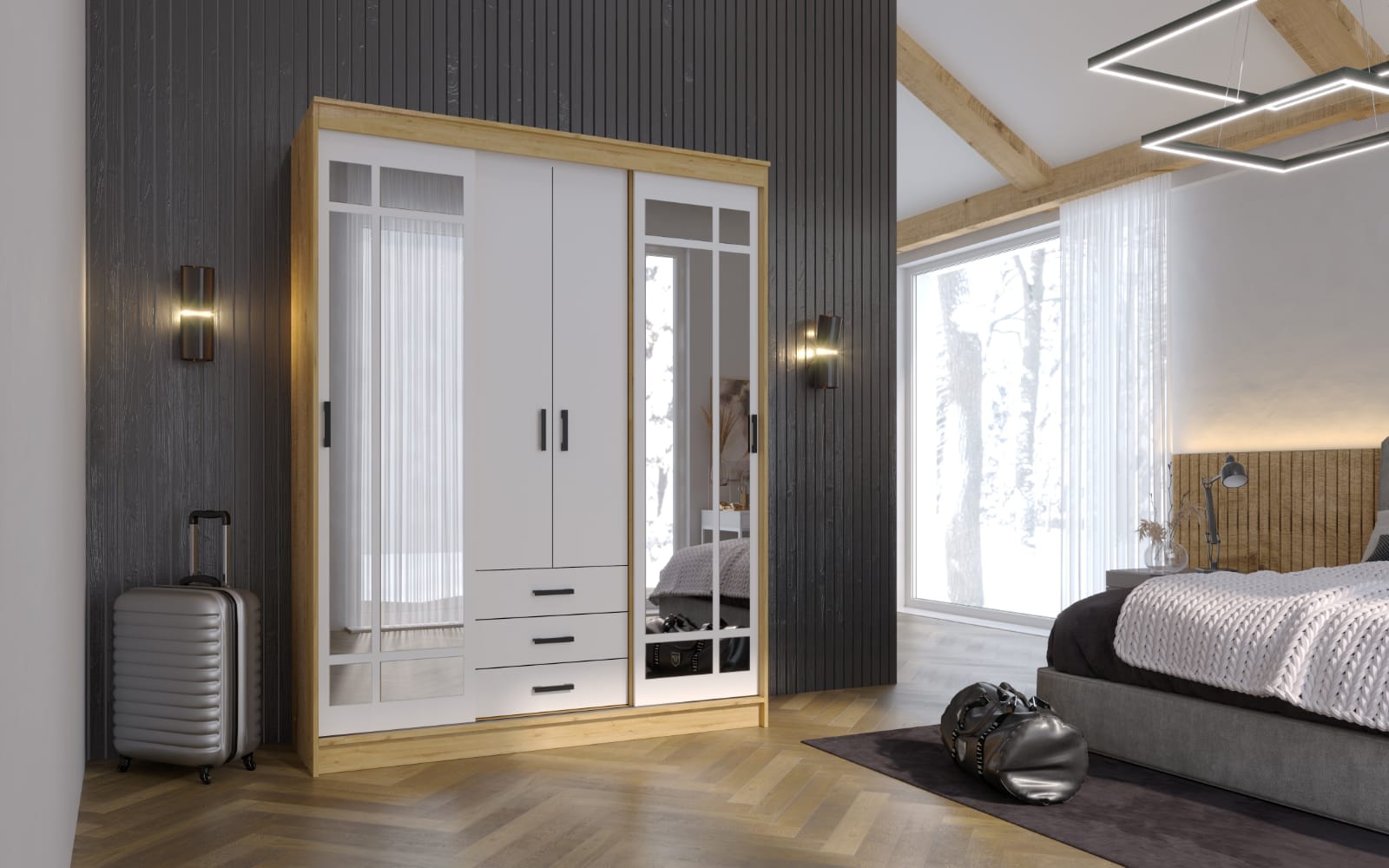 Доставили быстро,на следующий день ребята собрали.Шкаф полностью соответствует фото и описанию.Красивый,крепкий,вместительный.Наличие зеркал на дрерцах делают комнату больше и светлее.