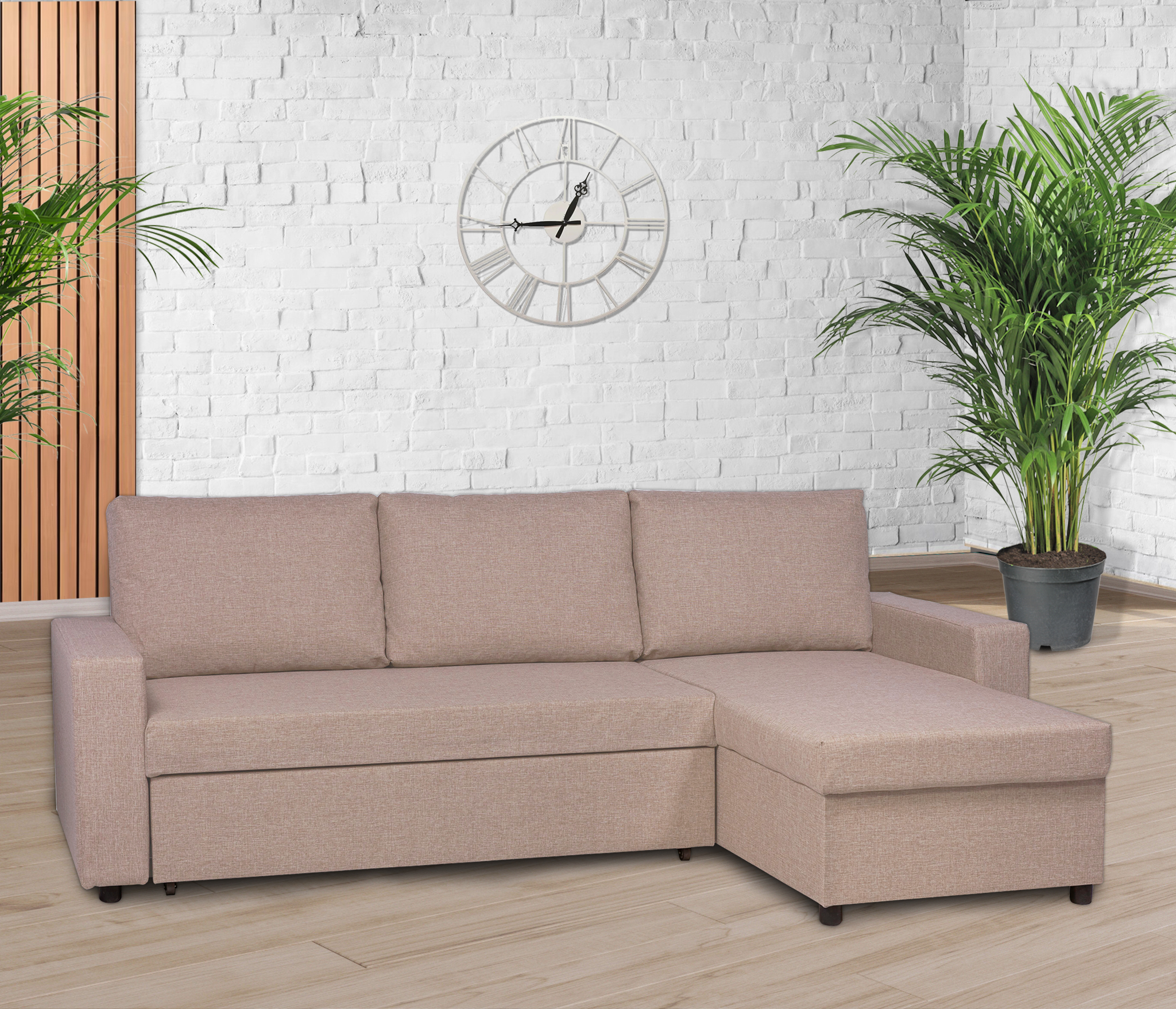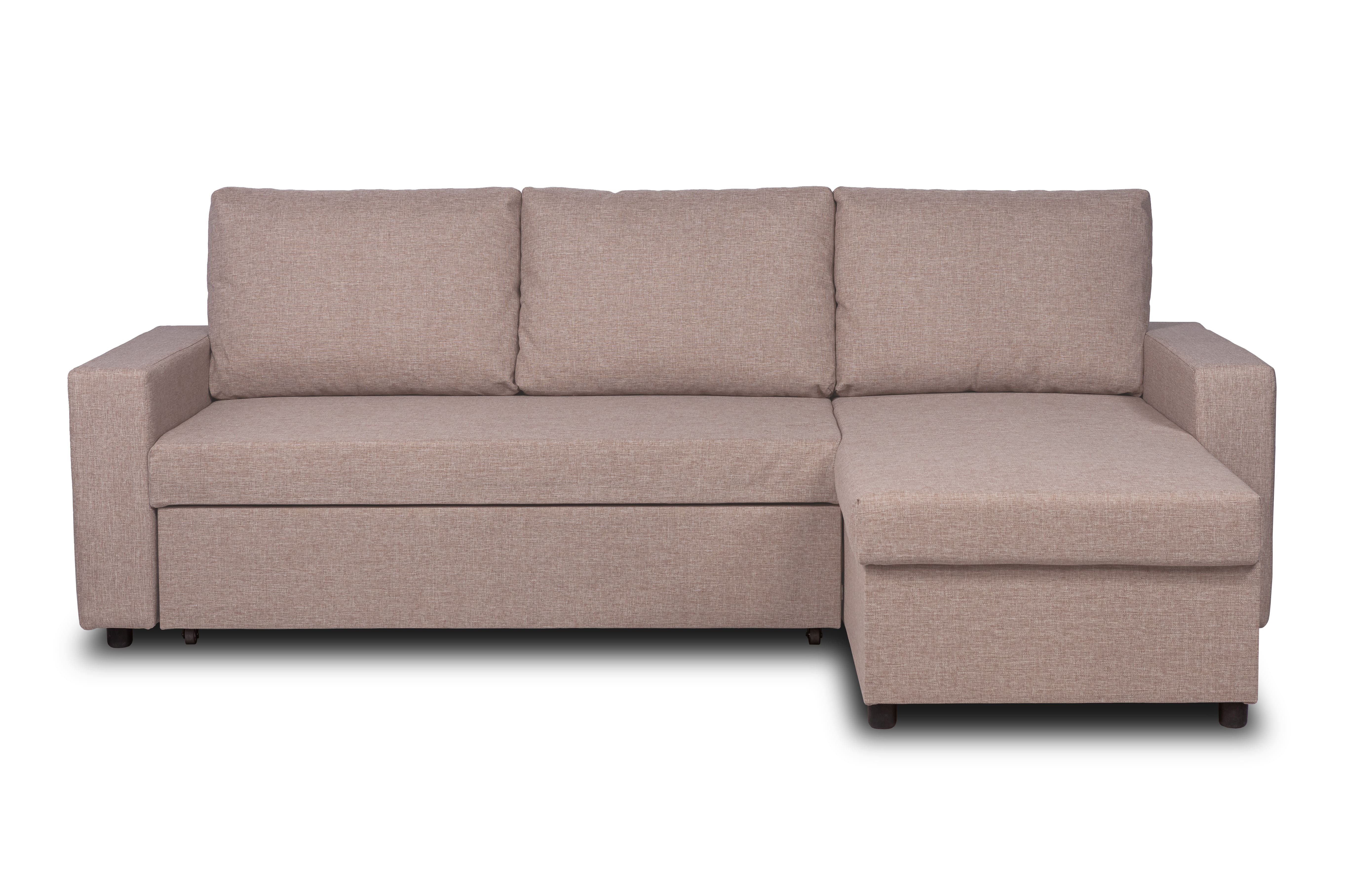 Удобный и функциональный – угловой диван-кровать. Современный угловой диван - кровать станет незаменимым помощником в гостиной, когда в доме собралась большая компания. Его основным преимуществом является наличие универсального угла, местоположение которого можно выбрать во время сборки. В оттоманке дивана предусмотрен вместительный ящик для хранения вещей или спальных принадлежностей. Надежный механизм трансформации «дельфин» позволяет легко трансформировать диван с габаритами 235х90х155 см в спальное место размером 143х204 см. Под приятной на ощупь обивкой из ткани рогожка располагаются качественные и долговечные наполнители: синтепон и пенополиуретан (ППУ). Наполнитель дивана – ППУ (Пенополиуретан) практичен и способен прослужить в течение многих лет, кроме того, такой материал безопасен и экологичен. ППУ пропускает воздух, поэтому гигиеничен. Для обивки дивана используется практичная и долговечная обивочная ткань Модерно (тип плетения - рогожка). Состав ткани 100% полипропилен, ткань устойчива к истиранию, достаточно прочная, чтобы диван прослужил многие годы, сохраняя свежесть и функциональность. Диван в ткани рогожка идеально подойдет в квартиру, где есть домашние животные. Уход достаточно прост. Для удаления пыли можно использовать пылесос.