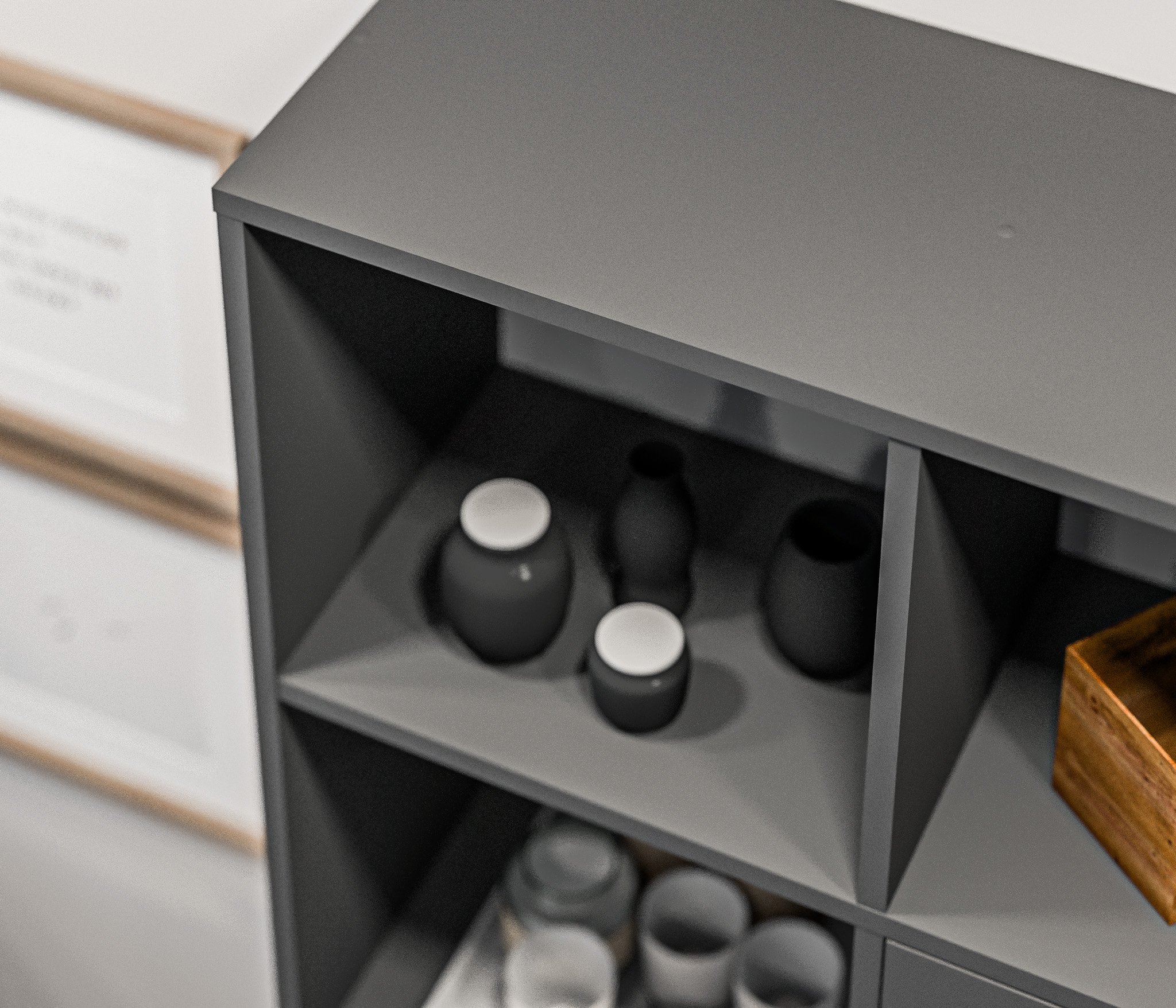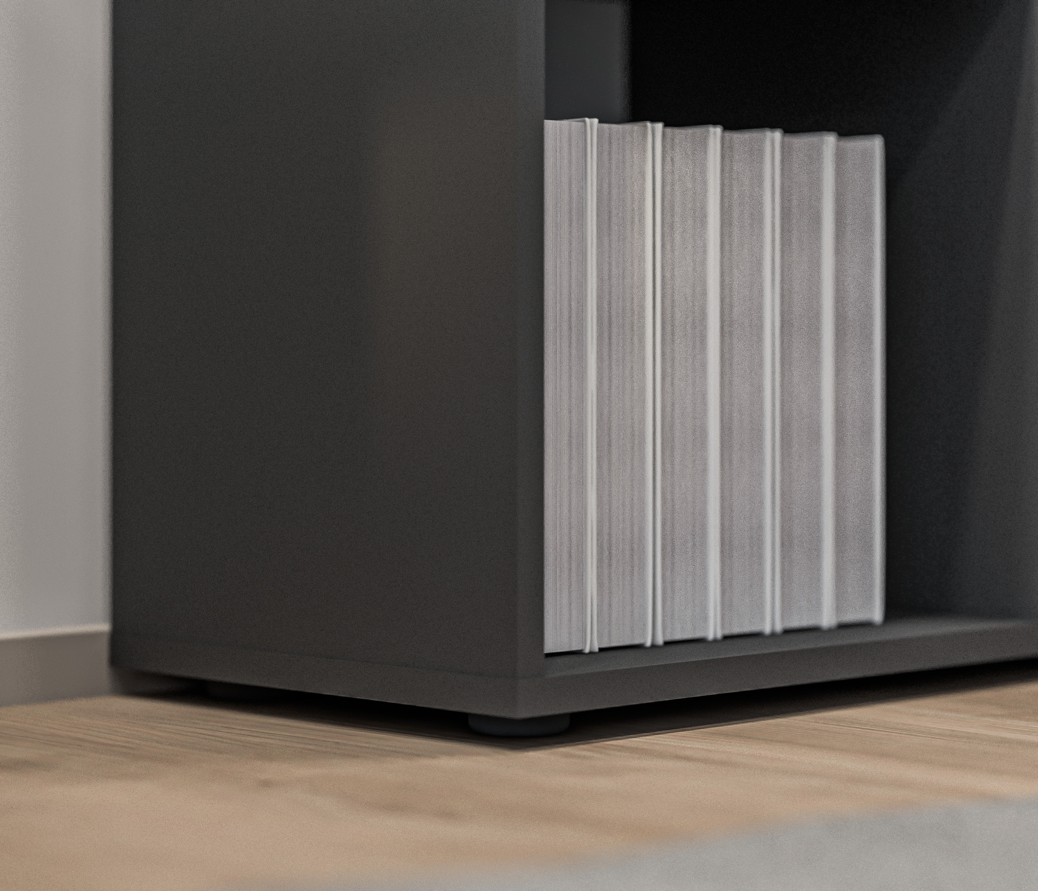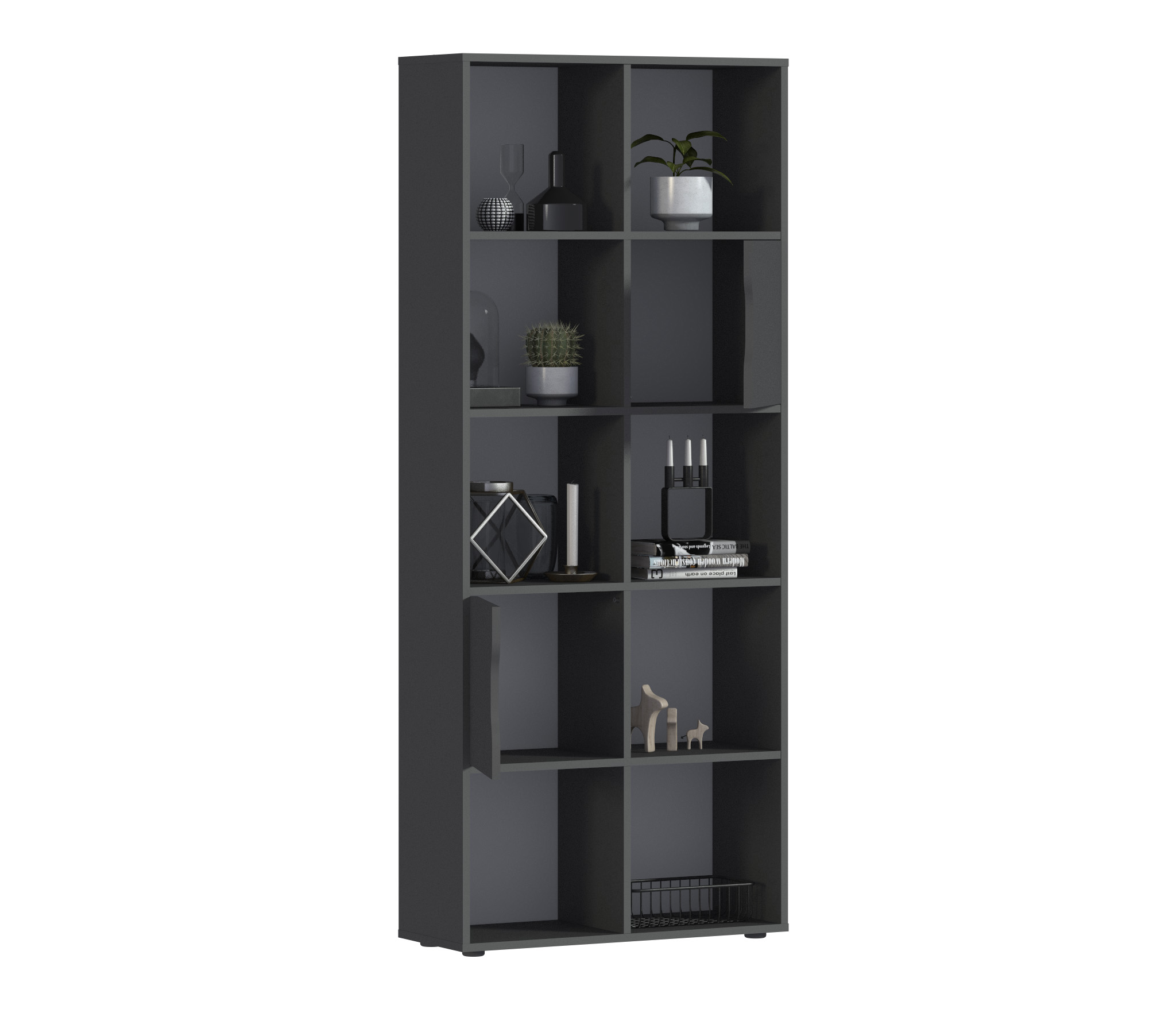 Стеллаж состоит из пяти ярусов и десяти полок, предлагая достаточно места для размещения книг, декоративных предметов, файлов и других вещей. Из этих десяти полок две закрыты дверцами, что позволяет вам хранить предметы вне прямого обзора и обеспечивает защиту от пыли и внешних воздействий.