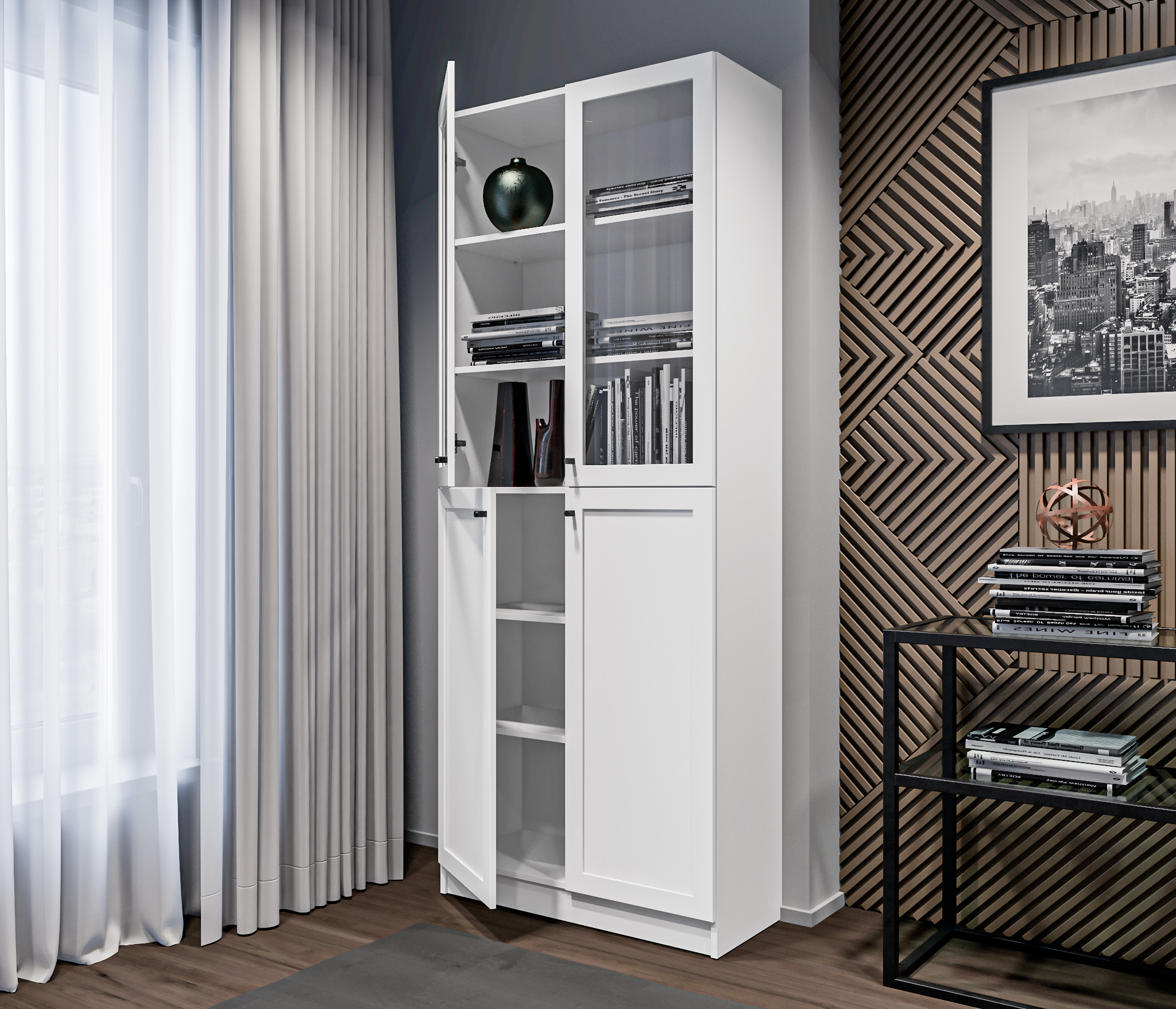 МС Твин предоставляет возможность собрать шкаф или стеллаж по своему вкусу. Вы сами выбираете размеры, цвет ручек: белый или черный, наполнение: ящик или полки. Помимо этого, вы можете решить, оставить фасады глухими или выбрать стеклянные, чтобы добавить прозрачности и легкости в ваш интерьер. Создайте шкаф-стеллаж, который идеально подходит для ваших потребностей и вписывается в ваш стиль.